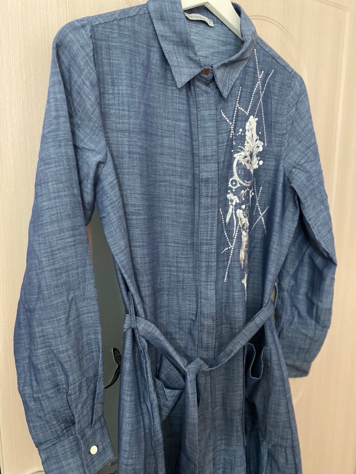 Bol kesim, uzun kollu kot elbise Yaka ve düğmeli ön detayları ile nakış süslemeli, bohem tarzda günlük kullanıma uygun.