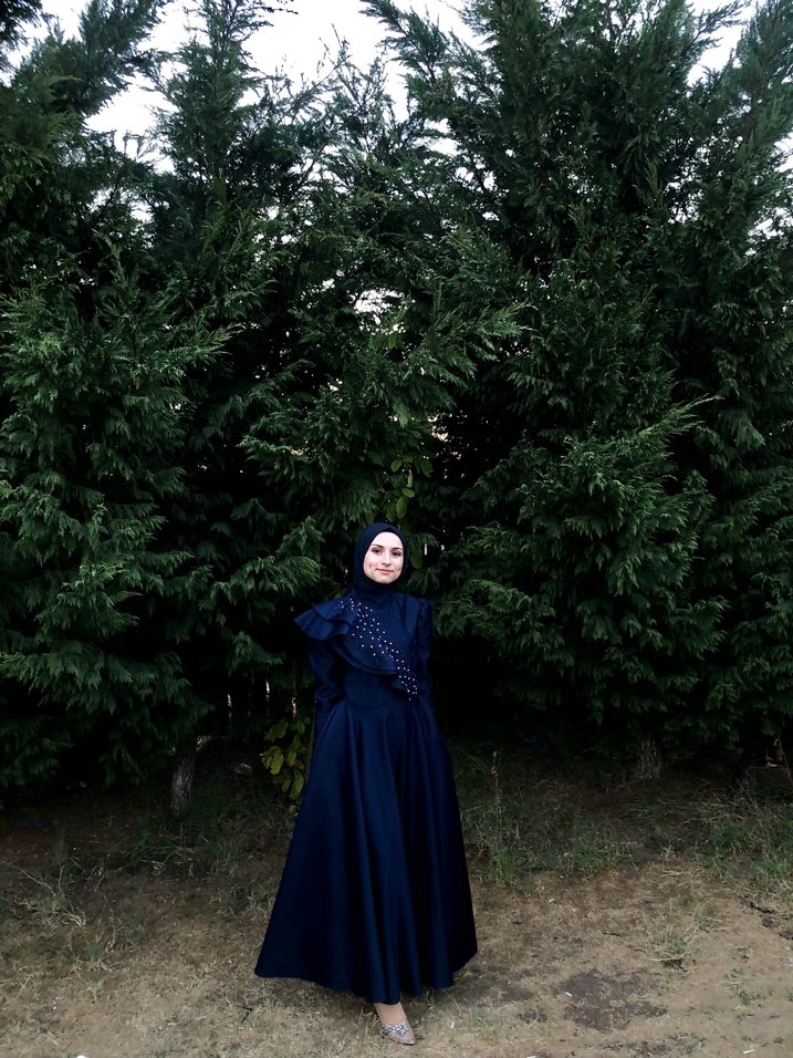 Nakışlı detaylara sahip, yüksek yakalı ve uzun kollu lacivert uzun abiye. Bol kesimli ve drapeli, mütevazı ve gotik tarzlar için uygun, düğünlere ideal.