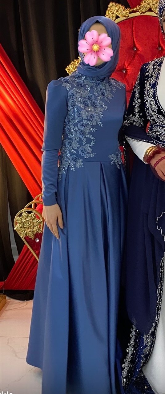 Nakışlı, Uzun Kollu Mavi Abiye Elbise