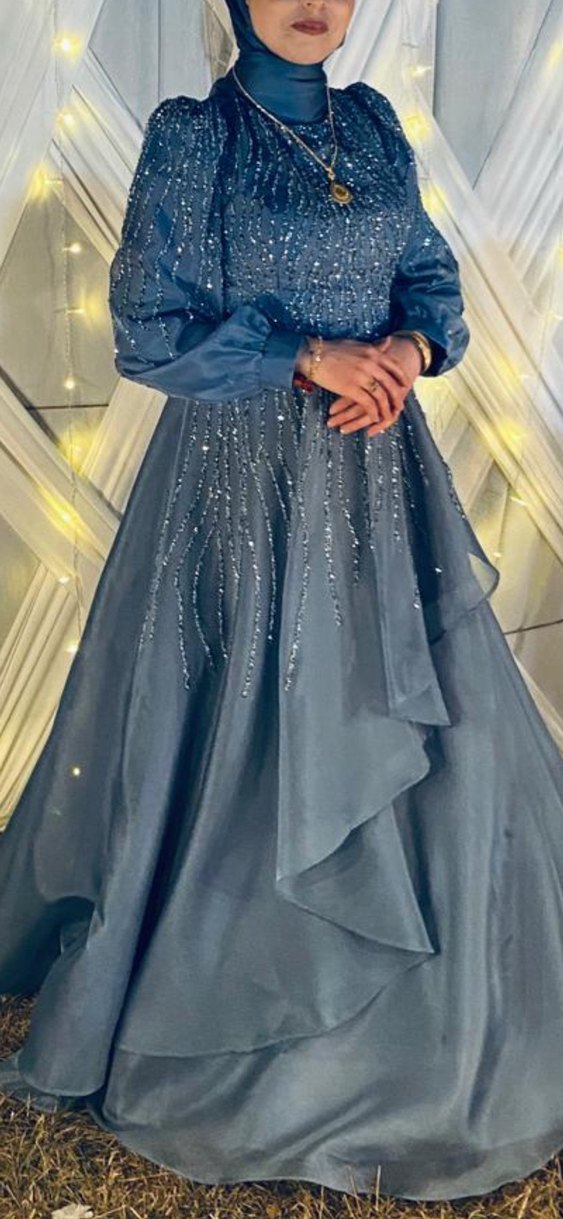 Nakışlı detaylara ve kesimli yaka tasarımına sahip uzun kollu mavi abiye elbise, düğünler için uygundur. Düzenli kesim ve zarif bir görünüme sahiptir. * Hafif hasarlıdır, hasar durumu fotoğrafta gösterilmiştir. Uhu izi bulunmaktadır. Bu yüzden fiyatı uygundur. ** Elbiseye uygun taç 150 ₺ fiyatındadır.