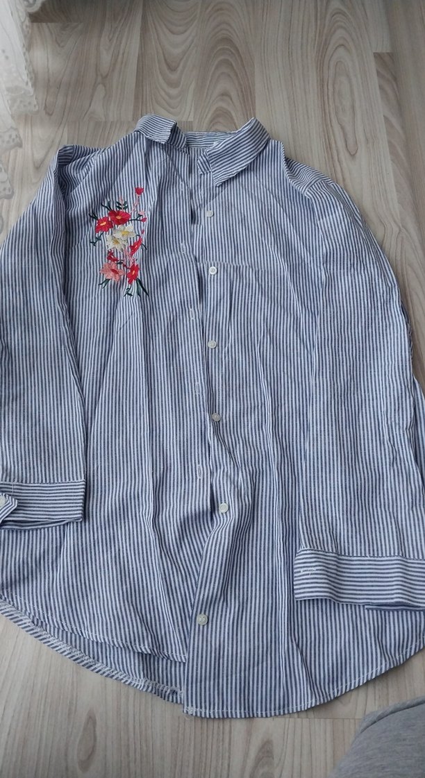 Mavi, uzun kollu, yakalı ve düğmeli kadın gömleği. Önünde nakış detayları bulunur. Rahat kesimli ve yumuşak dokulu kumaştan üretilmiştir.