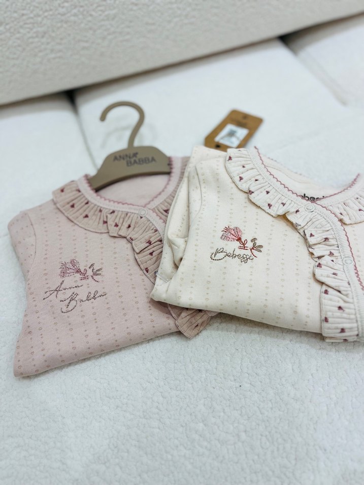 Pastel pembe renkli, uzun kollu, yuvarlak yakalı bebek kız body. Nakışlı çiçek desenleri ve ön kısmında fırfır detayları vardır. Yumuşak örgü kumaştan üretilmiştir.