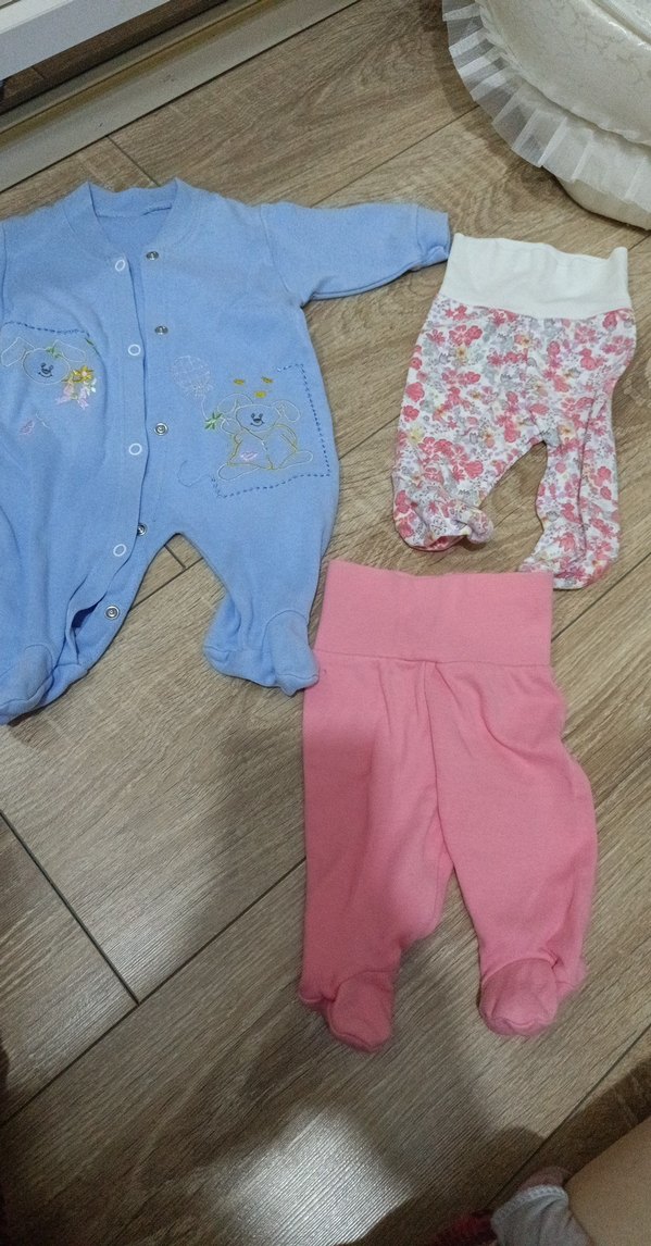Nakışlı detaylara sahip uzun kollu örme mavi tulum ve iki adet pembe pantolon, biri çiçek desenli diğeri düz, pastel renklerde bebek kız kıyafet seti.