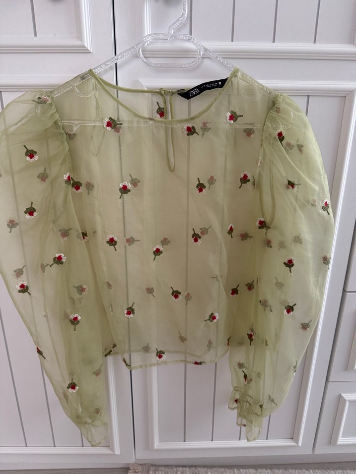 Nakışlı çiçek desenleriyle uzun kollu, yuvarlak yakalı, bol kesim pastel yeşil renkli bluz.