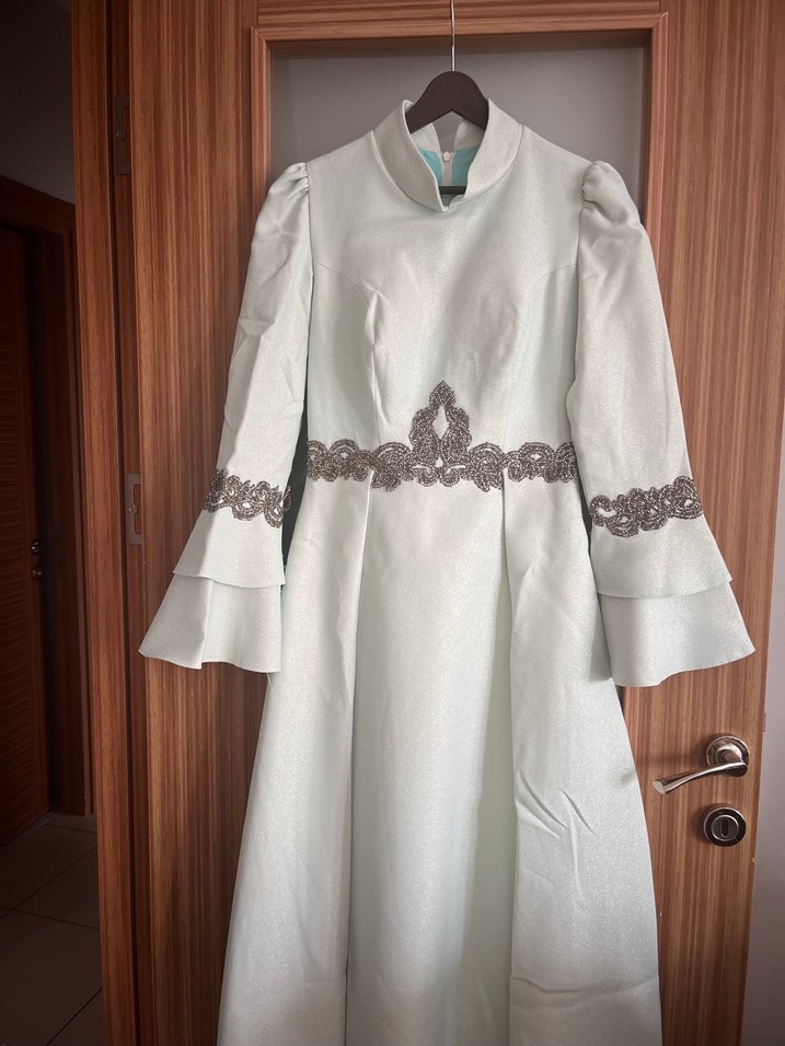 Nakışlı Uzun Kollu su yeşili Vintage Abiye Elbise