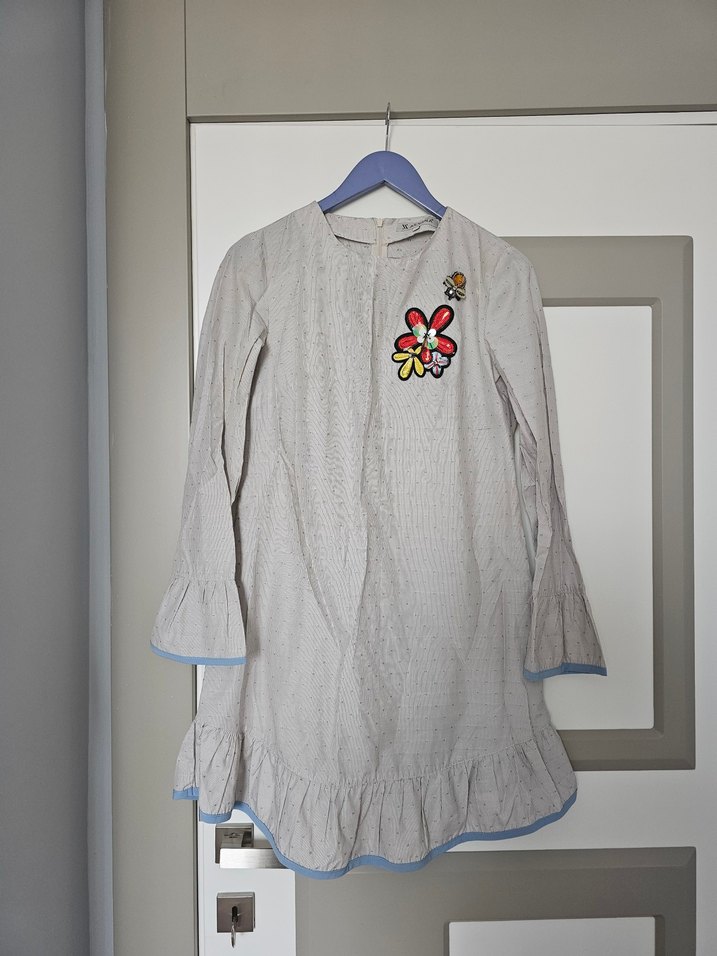 Yumuşak keten kumaştan, uzun kollu, nakışlı ve düğmeli, bol kesim midi tunik Bisiklet yaka ve fırfırlı etek ucu detayları bulunur.