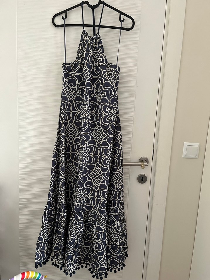Lacivert bohem tarzda uzun elbise, nakışlı desenlere ve boyundan bağlama özelliğine sahiptir. Düzenli kesim, volan detaylarıyla romantik akşamlar için uygundur.