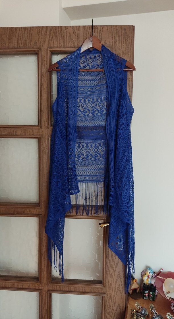 Nakışlı desenlere sahip, uzun ve kolsuz mavi örgü pareo. Salaş kesimi, drapeli ve püsküllü detaylarıyla bohem tarzını yansıtıyor.plaj kullanım için uygun.