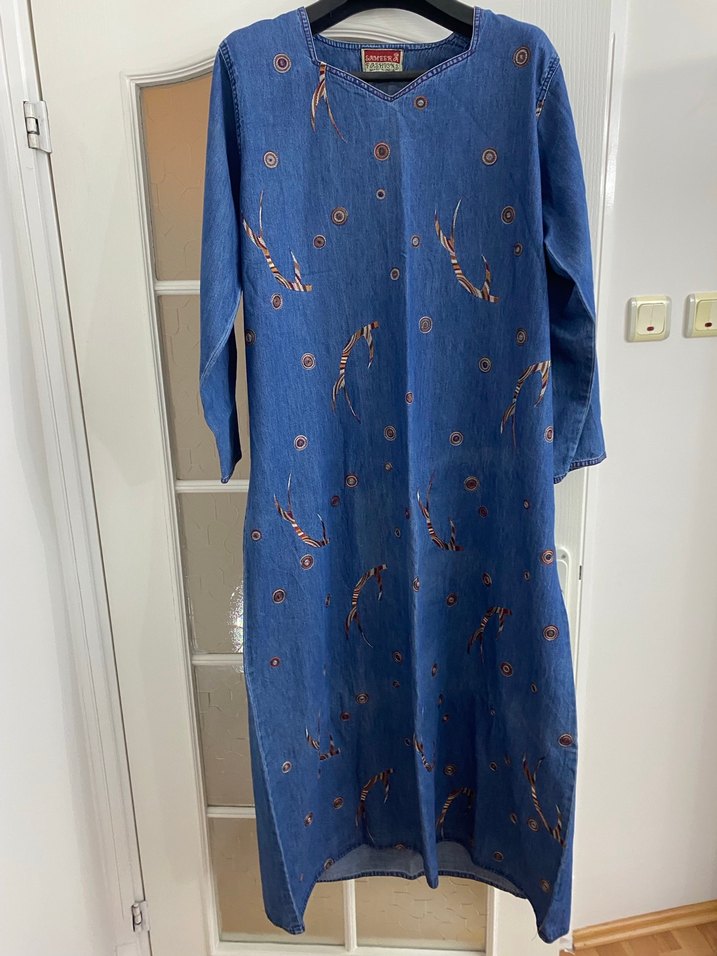 Nakışlı desenlere sahip uzun mavi denim elbise, bol kesim, uzun kollu ve yuvarlak yakalıdır. Bohem tarzda, günlük kullanıma uygundur.