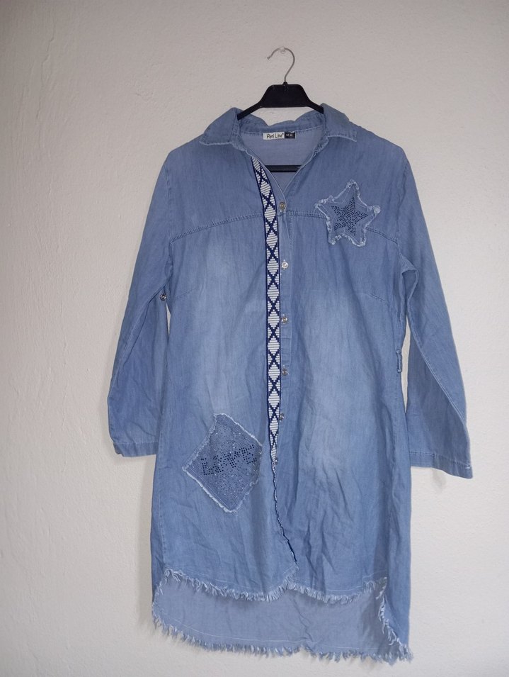 Mavi uzun kot ceket, düğmeli, nakışlı detaylara ve kesik yakaya sahip. Bol kesim ve uzun kollu, bohem tarzını yansıtıyor.