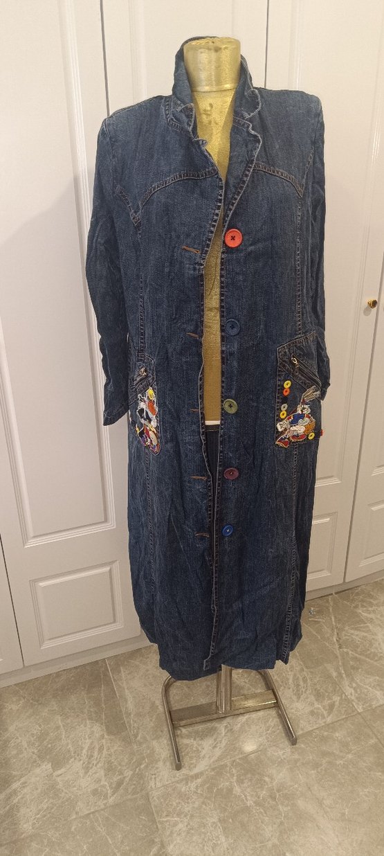 Bu uzun mavi kot ceket, düğmeli ön kısmı ve ceplerinde nakış detaylarıyla bol kesimdir. Bohem ve retro tarzda, günlük kullanıma uygundur.
