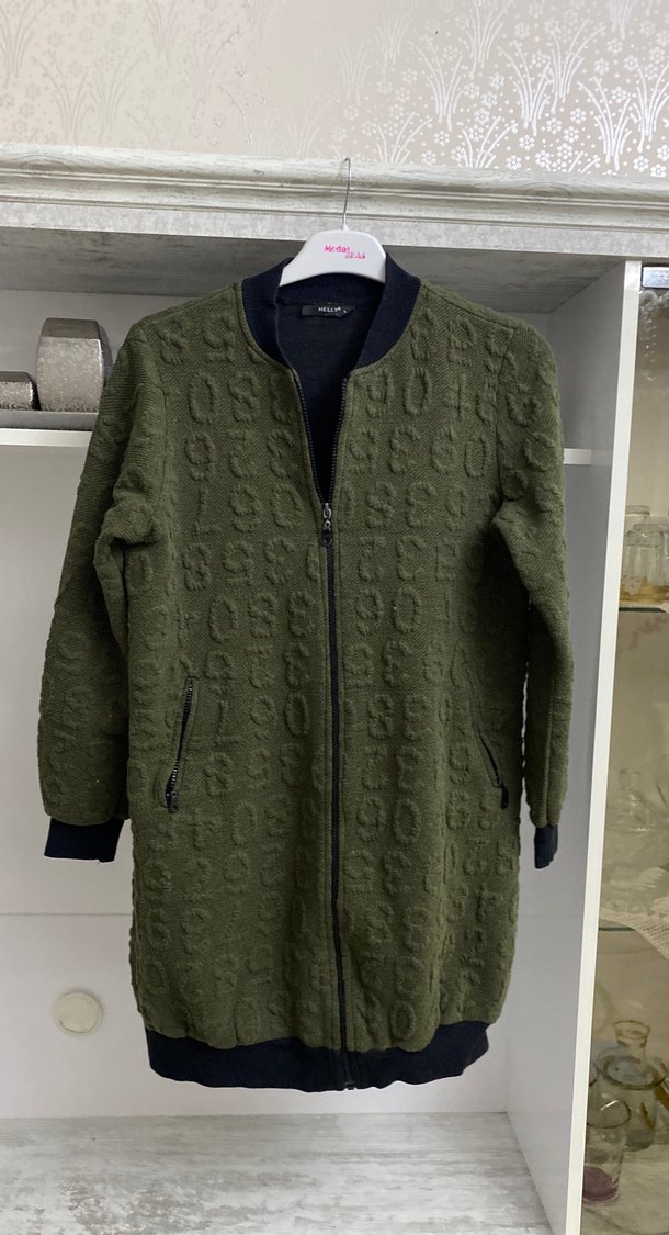 Uzun kesim, nakışlı desenli örgü kadın mont. Bol kesim, uzun kollu ve bisiklet yaka ile günlük rahat kullanım için uygundur.