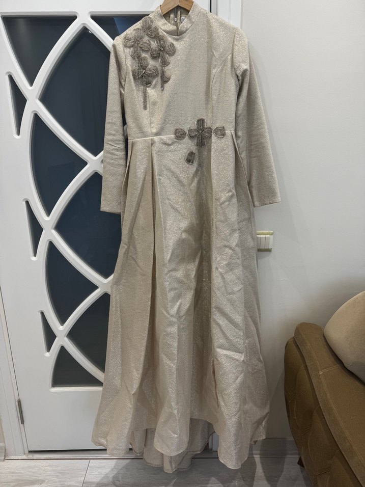 Uzun kollu, notched lapel yakalı ve nakışlı detaylara sahip bej uzun elbise. Dökümlü tasarımı ve regular fit kesimi ile düğünlere uygun. Arkasının eteğinde kuyruklu zarif bir detayı var. Nihan’dan almıştım. Herhangi bir defosu yok sadece nişanda giyinildi. Işıkta altın sarısı gibi parlıyor