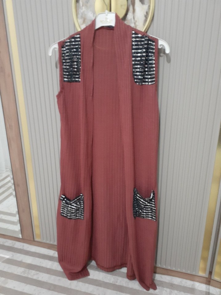 koyu ten renkte, uzun ve piliseli sentetik kumaştan kadın yelek. Kolsuz, straplez ve nakışlı desenleriyle bohem tarzda rahat bir görünüm sunar.