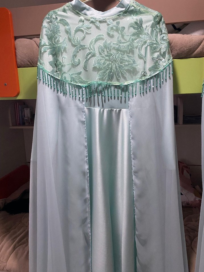 Turkuaz renkte, nakışlı ve püsküllü detaylı, uzun salaş tesettür abiye elbise. Düğün için uygun, sade tarzda.