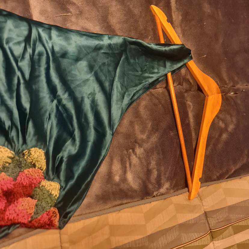 Bohem tarzda, nakışlı desenli, uzun ve bol kesim kadın elbisesi. tek Askı ve koyu haki rengi ile dikkat çeker.