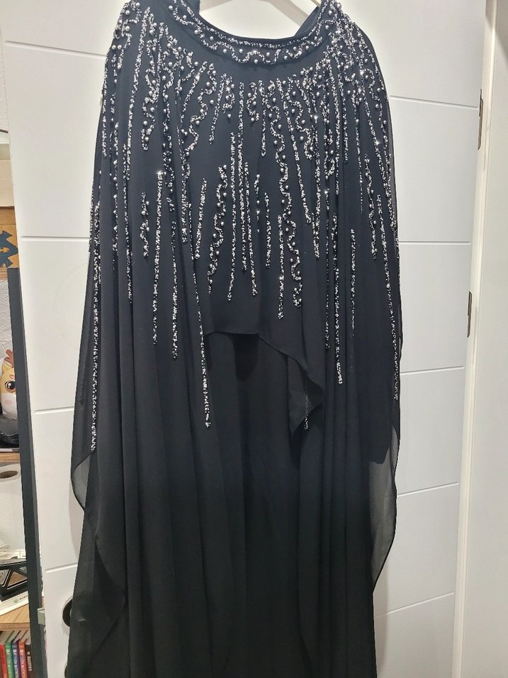 Nakışlı detaylara sahip siyah uzun drapeli elbise. Askılı kollu, straplez yakalı, bol kesim ve gotik avant-garde tarzda, parti için uygun. / kendinden sabit pelerinlidir şifon kumaşa sahiptir bir kez giyilip temizlenmistir islemelerinde hiçbir kusur yoktur 46-52 beden arasına uygundur