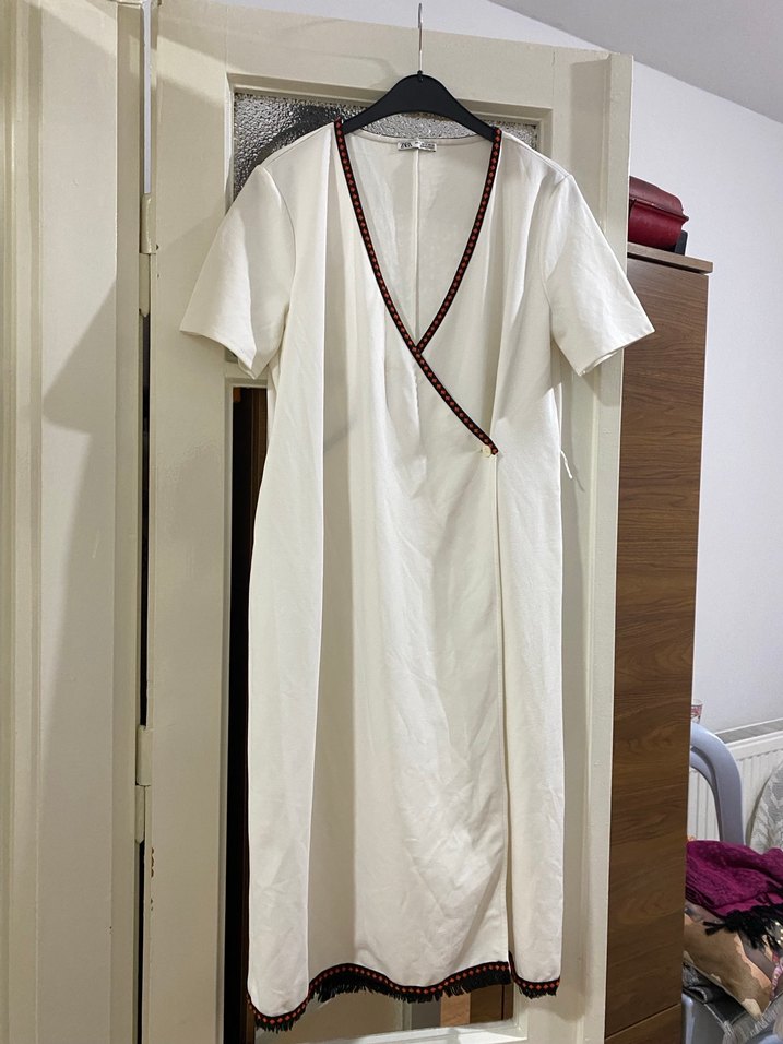 Uzun boy, kısa kollu ve V yaka beyaz elbise. Kenarlarında nakış detaylarıyla sade ve şık bir görünüm sunar.