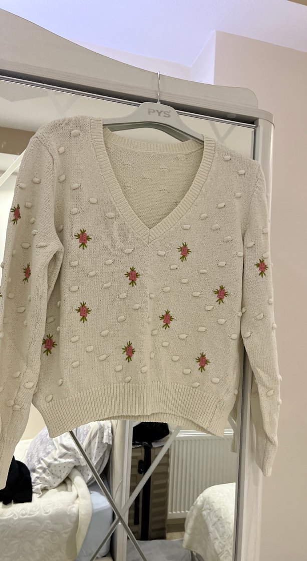 Bu beyaz triko hırka, V yaka ve nakışlı çiçek desenlerine sahiptir. Uzun kollu ve bol, midi boyda rahat bir kesime sahiptir, bohem sokak tarzı için uygundur.