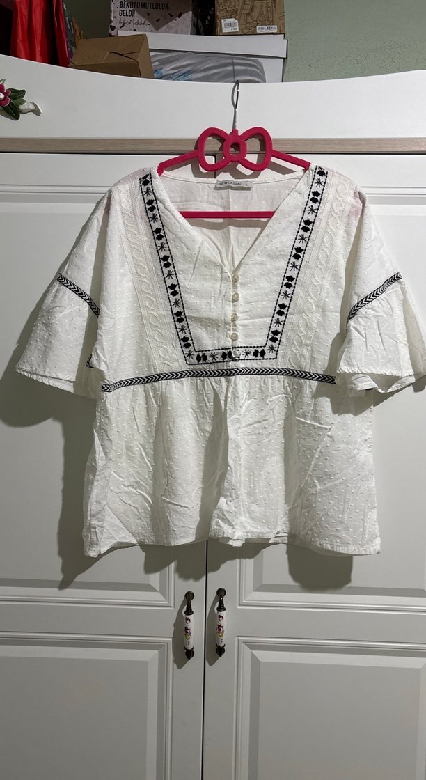 Pamuklu, kısa kollu, düğmeli V yakalı, nakışlı, bol kesim beyaz bohem kadın bluz.