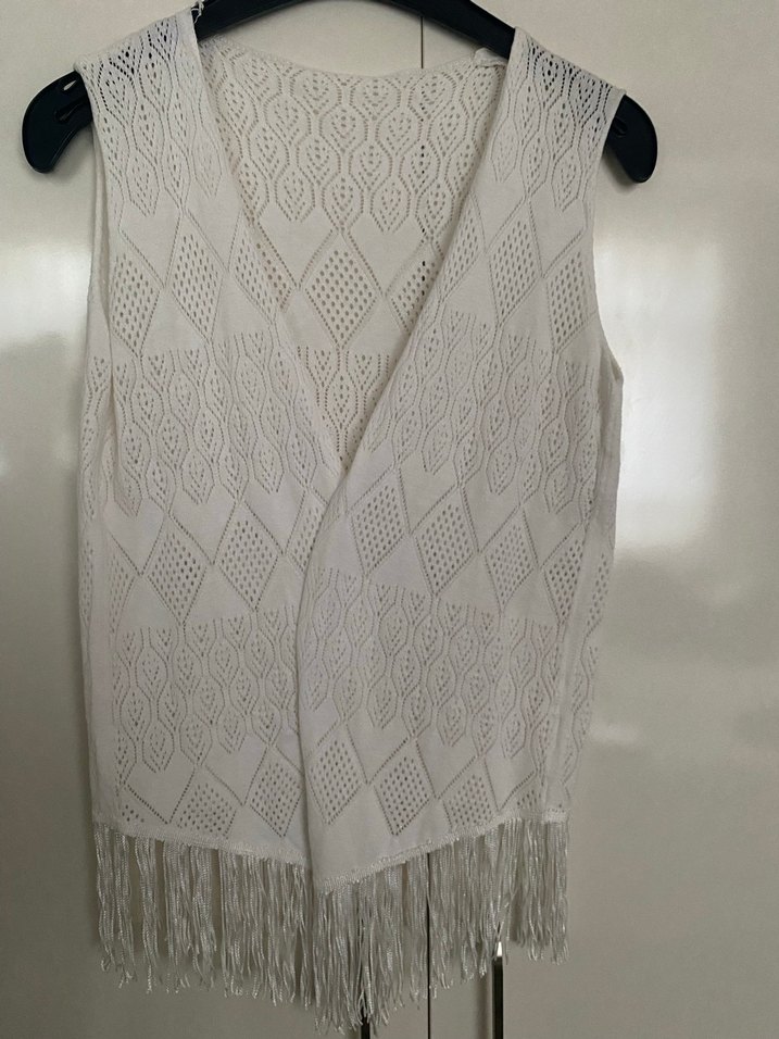Nakışlı desenlere sahip, püsküllü uçlu, V yakalı kolsuz triko yelek. Normal boyda ve rahat kesimli, bohem stil için uygundur.