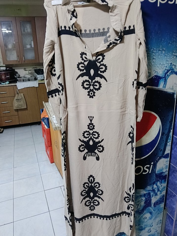Kadınlar için uzun, bol kesim, uzun kollu ve V yakalı elbise. Yumuşak sentetik kumaştan, bej zemin üzerinde siyah nakışlı desenlere ve drapeli tasarıma sahip bohem tarzda. Günlük kullanım için uygundur.