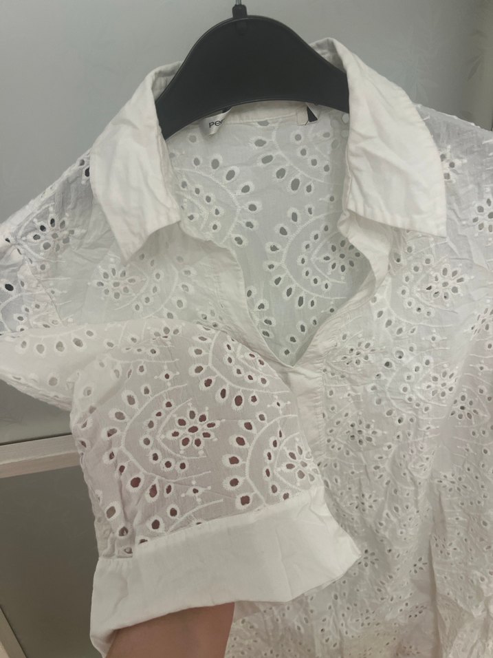 Beyaz keten kumaştan yapılmış, V yakalı ve kısa kollu kadın gömleği. Nakışlı desenlere sahip, düğmeli ve bol kesimdir, bohem tarzına uygundur. Beyaz, brode (fisto) işlemeli kumaş Çiçek desenli delikli nakış detayları Klasik gömlek yaka Kısa kol Bel kısmı düz ve hafif oturan kesim Yazlık, ferah ve romantik bir görünümü var Günlük kullanıma, yaz kombinlerine çok uygun