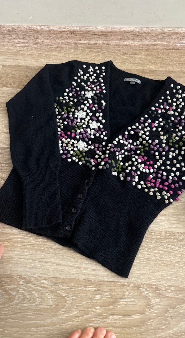 Düğmeli, V yaka ve renkli nakış detaylı koyu renk örme hırka. Uzun kollu, bol kesim ve midi boyda rahat bir tasarıma sahip. Resimde göründüğü gibi tiftikleri var