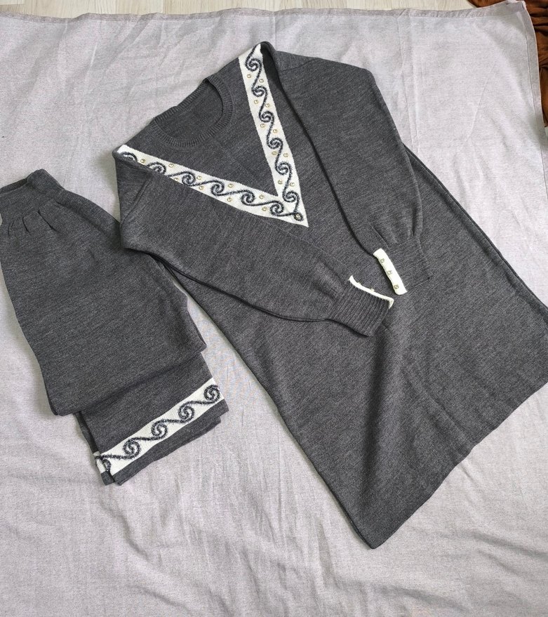 Uzun, gri renkli örgü kadın kazak, V yaka ve nakış detaylarına sahiptir. Uzun kollu, rahat kesim ve bohem tarzıyla günlük kullanıma uygundur.