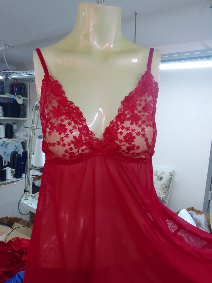 Nakışlı çiçek desenli, V yakalı, askılı, bol kesim kırmızı midi gecelik. Canlı renklerle tasarlanmıştır.