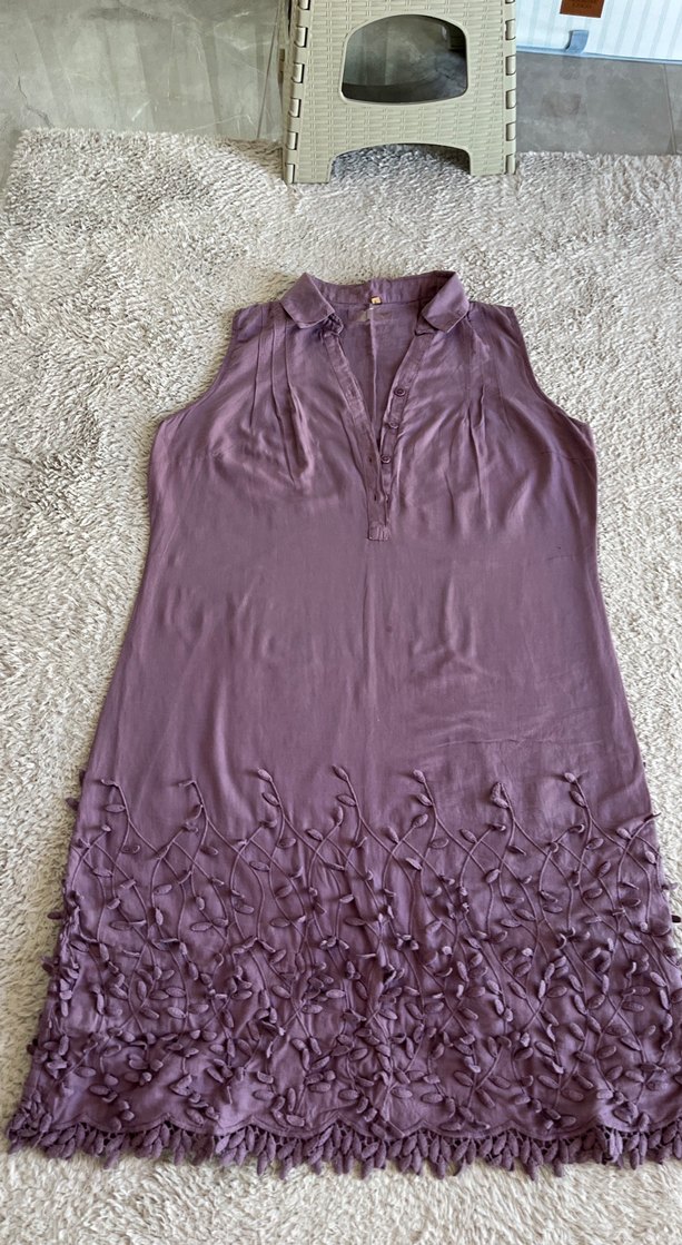 Kolsuz, V yakalı bohem elbise, etek kısmında nakışlı fırfır detaylarıyla, yumuşak keten kumaştan, mat mor tonunda.