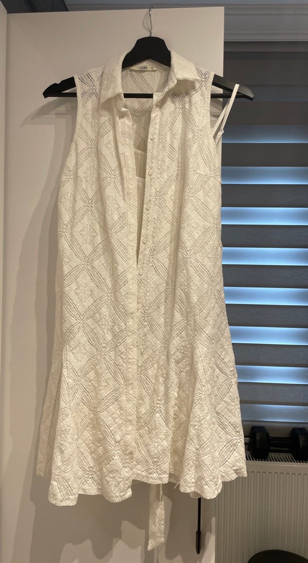 Nakışlı desenlere ve V yakaya sahip kolsuz mini elbise. Keten kumaştan, drapeli ve regular fit kesimle günlük kullanıma uygun.