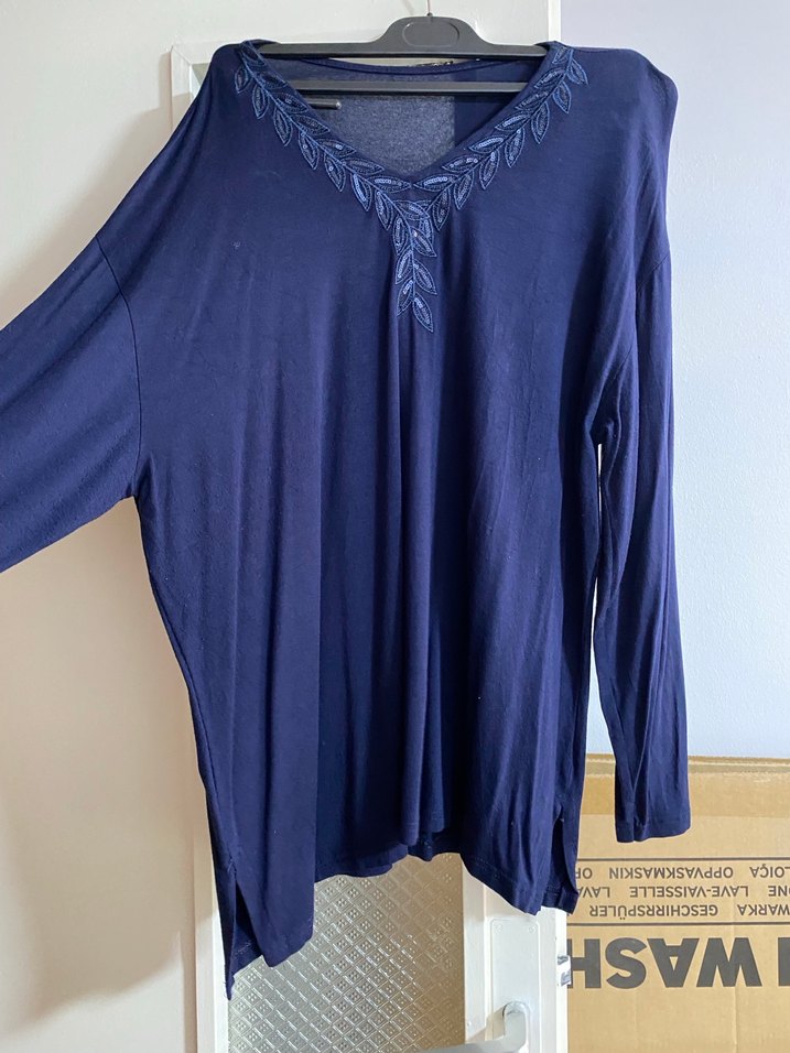 Lacivert, uzun kollu, bol kesim kadın bluz. V yaka çevresinde nakış detayları bulunur. Rahat ve yumuşak keten kumaştan, bohem tarzda.