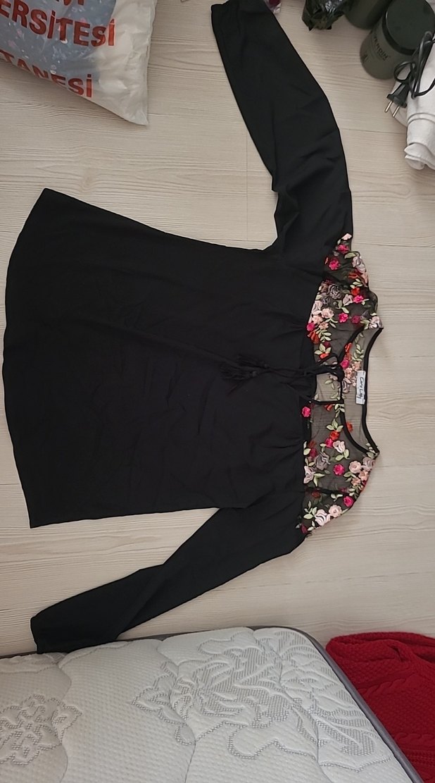 Uzun kollu, bol kesim ve kısa boyda siyah bluz. V yaka, nakışlı çiçek detayları ve tülden yapilmis üst kısmi ile günlük tarza uygun.