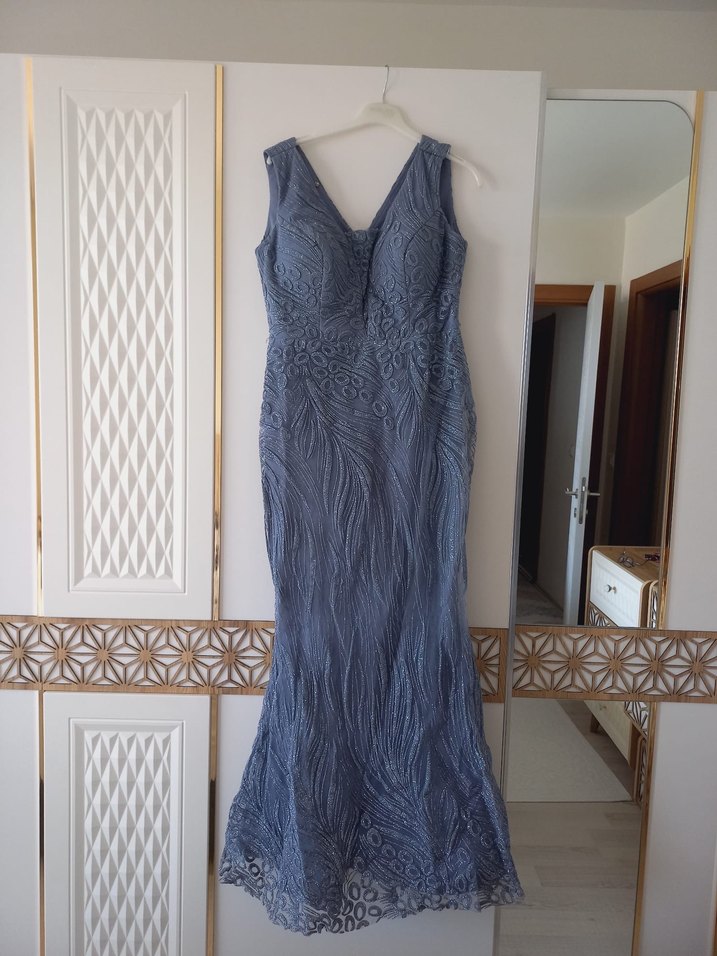 Nakışlı, drapeli ve V yakalı, uzun lacivert elbise. Klasik ve vintage esintili, düğünler için uygun, kollu olmayan ve vücuda oturan kesime sahip.