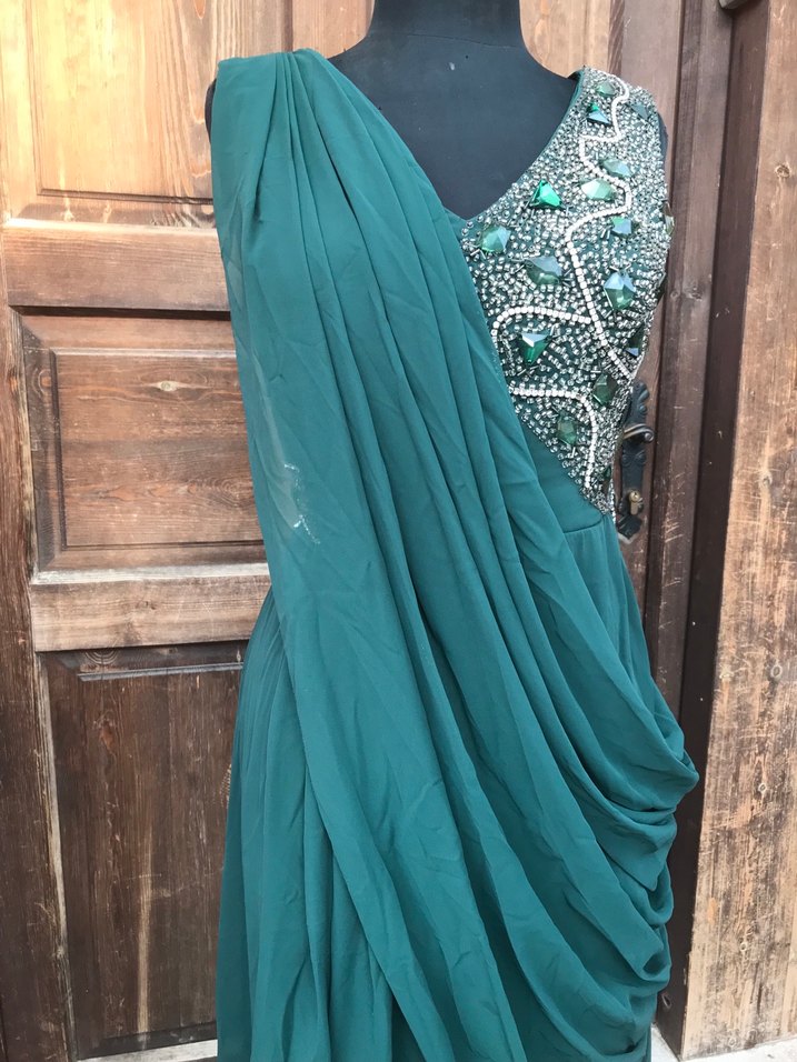 Nakışlı, V yakalı, kolsuz, dökümlü ve bol kesim turkuaz uzun elbise, düğünler için uygundur. Bolerosu var. Ayrı alabilirsiniz 46 beden
