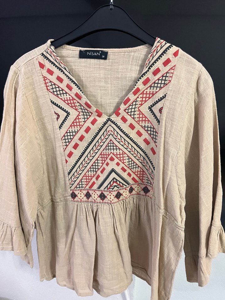 Bej renkli, yumuşak dokulu bohem bluz, V yakalı ve işlemeli boncuk detaylıdır. Uzun kollu, bol ve kısa kesimdir.