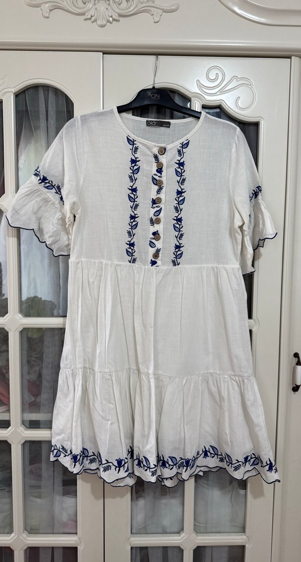 Pamuklu, beyaz mini tunik, nakışlı detaylar ve fırfırlı kısa kollara sahiptir. V yakalı, bol kesim ve bohem tarz için uygundur. Keten kumaş . Terletmiyor yaza uygun. Hamile ler de giyebilir marka temsili . Nakış işlemeli fırfırları mevcut