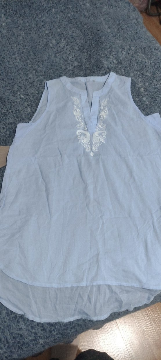 Beyaz keten kolsuz bluz, V yakalı ve nakış detaylıdır. Bol kesim ve drapeli tasarıma sahip, bohem tarzını yansıtır. Günlük kullanıma uygundur.