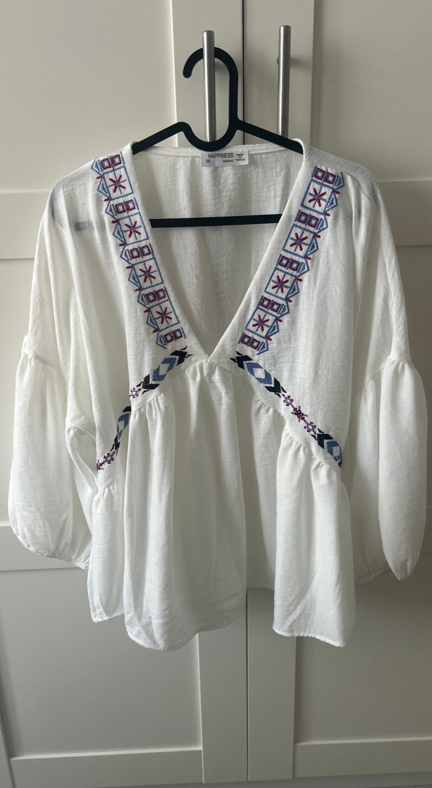 Pamuklu beyaz bluz, V yakalı ve nakış detaylıdır. Uzun, bol kollu ve drapeli rahat bir kesime sahiptir, günlük kullanıma uygundur. Bedeni olmadığından satıyorum. Güncel satış fiyatı 790 tl