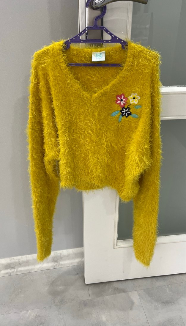 Sarı, uzun kollu, V yakalı bu triko kazak nakışlı çiçek desenine sahiptir. Salaş kesimi ve renkli dokusuyla rahat bir görünüm sunar.