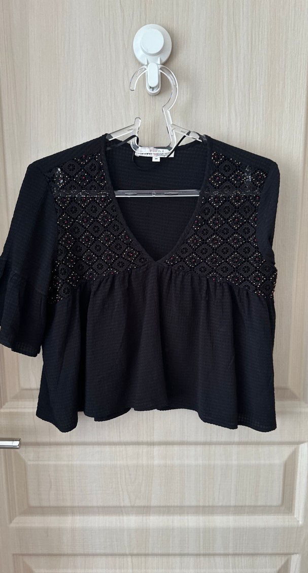 V yakalı, nakışlı detaylı siyah örgü bluz. Kısa kollu ve bol kesim, bohem tarz için uygun.