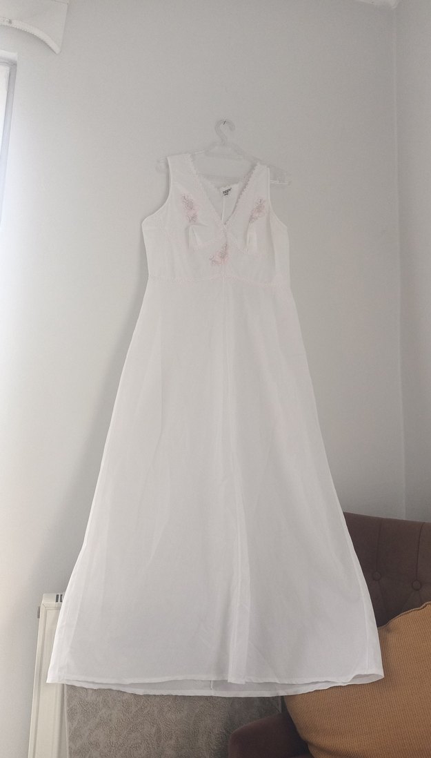 Nakışlı V Yakalı Uzun Beyaz Kadın gecelik sabahlık