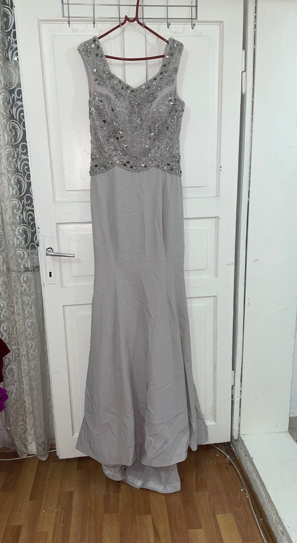 Nakışlı ve drapeli üst kısmıyla, V yakalı ve kolsuz uzun gri abiye elbise. Modern klasik tarzda, düğün ve özel davetler için uygundur. Uzunluğu 160 cm dir