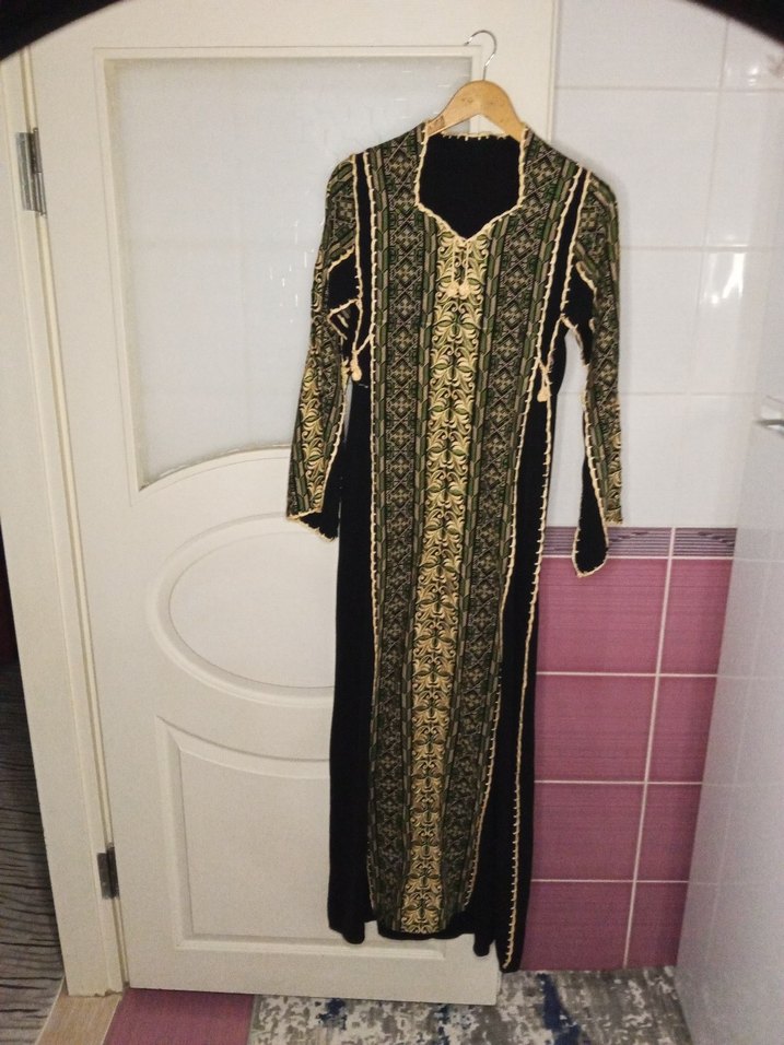 Nakış işlemeli tekstil kumaştan, dantel detaylı, V yakalı ve uzun kollu, uzun boy regular fit kadın elbisesi. Koyu renkli, çok renkli bohem tarzda.