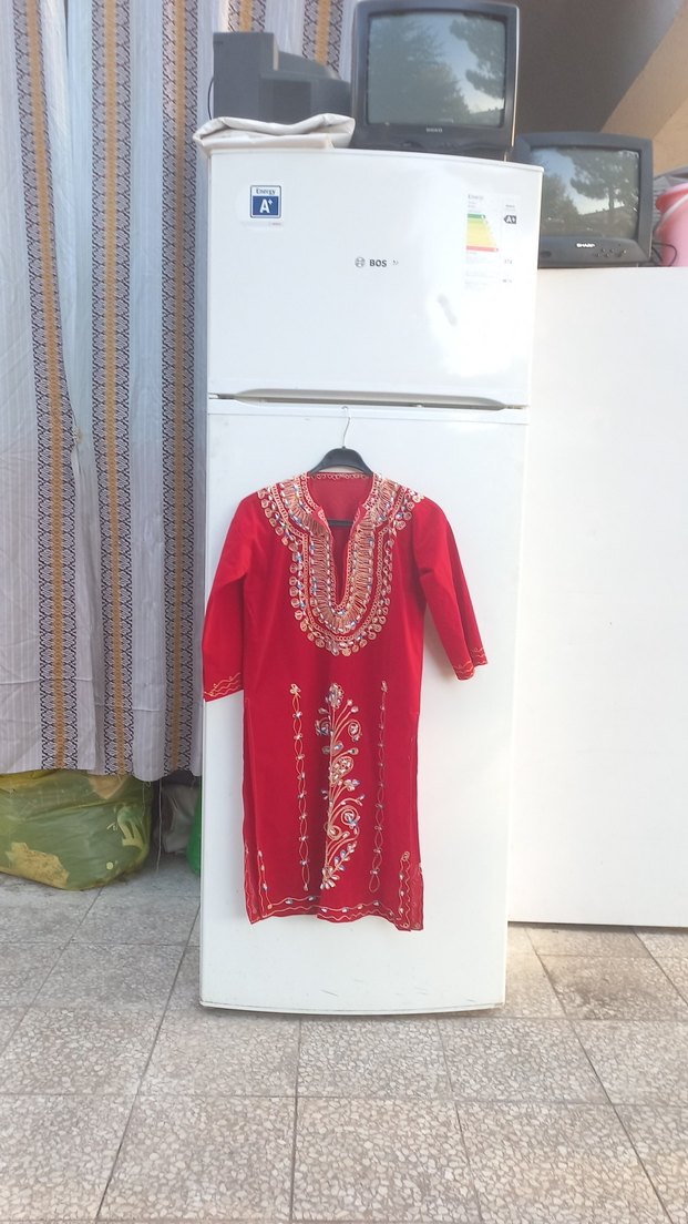 Nakışlı ve boncuk işlemeli, V yaka, kısa kollu uzun kırmızı tunik. Tekstil kumaş, bol kesim, günlük bohem tarz için uygundur. #kaftan