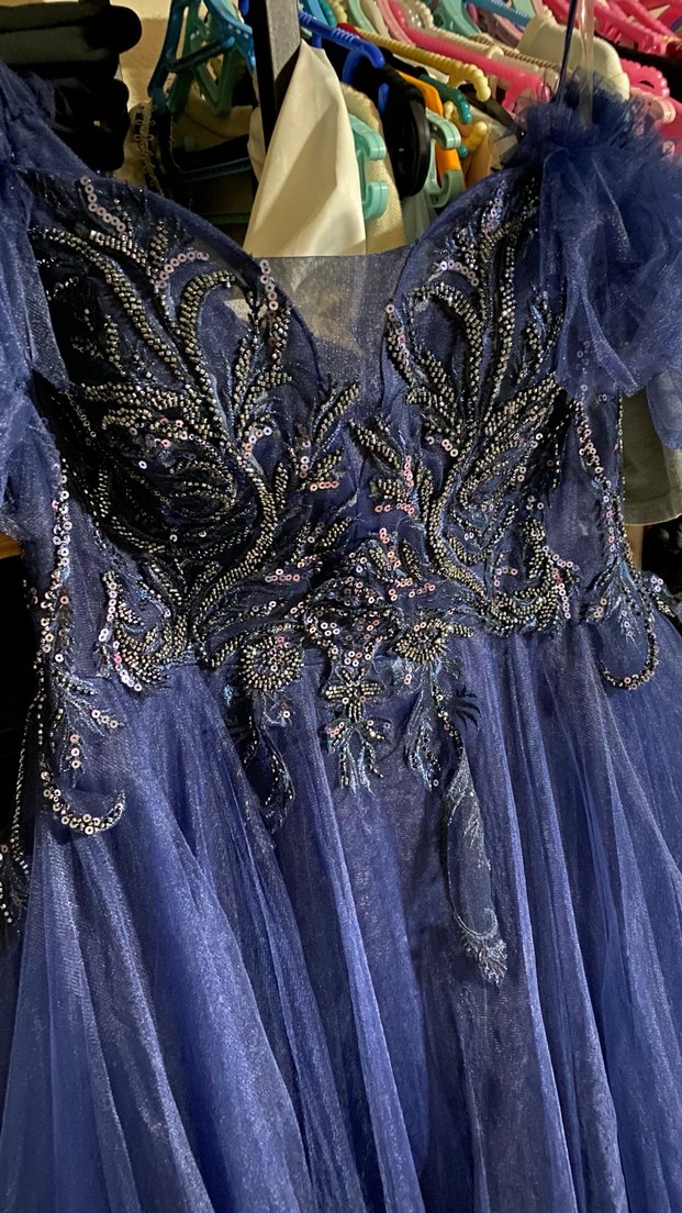 Nakışlı ve boncuk işlemeli lacivert uzun abiye, straplez yaka ve dar kesim. Eteği tül. Sadece bir kere kullanıldı.