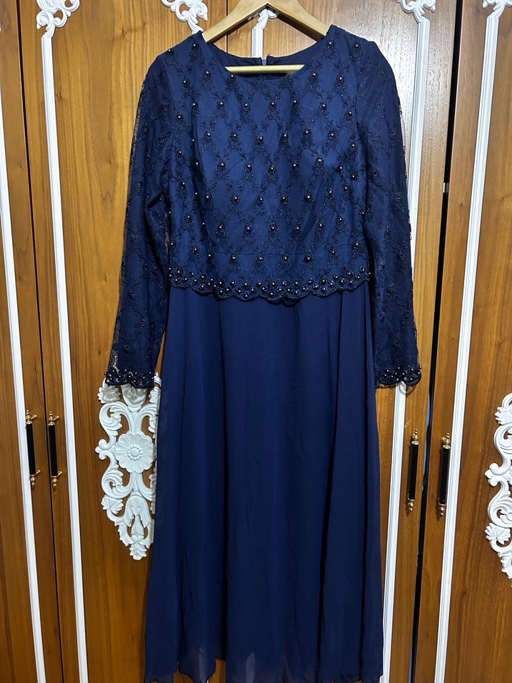 Lacivert uzun abiye elbise, nakış ve boncuk işlemeli üst kısmı ve uzun kollu tasarımıyla klasik ve şık bir görünüm sunar. ✨