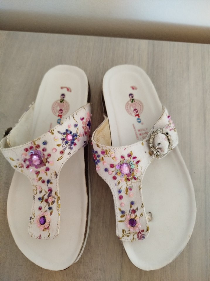 hiç giyilmedi, sıfır ürün.Nakışlı ve boncuklu beyaz dolgu topuk terlik, sentetik kumaştan yapılmıştır. 36 numara.parmak arası terlik.
