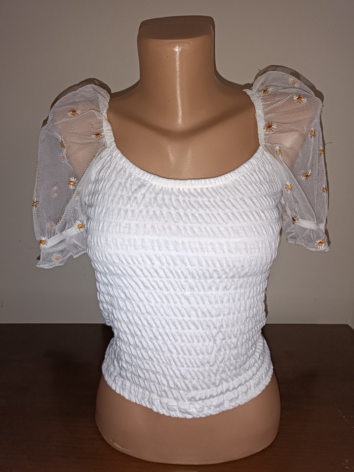 Nakışlı ve boncuklu detaylara sahip kısa balon kollu, beyaz mini ve vücuda oturan bluz. Minimalist sokak tarzı için uygun.